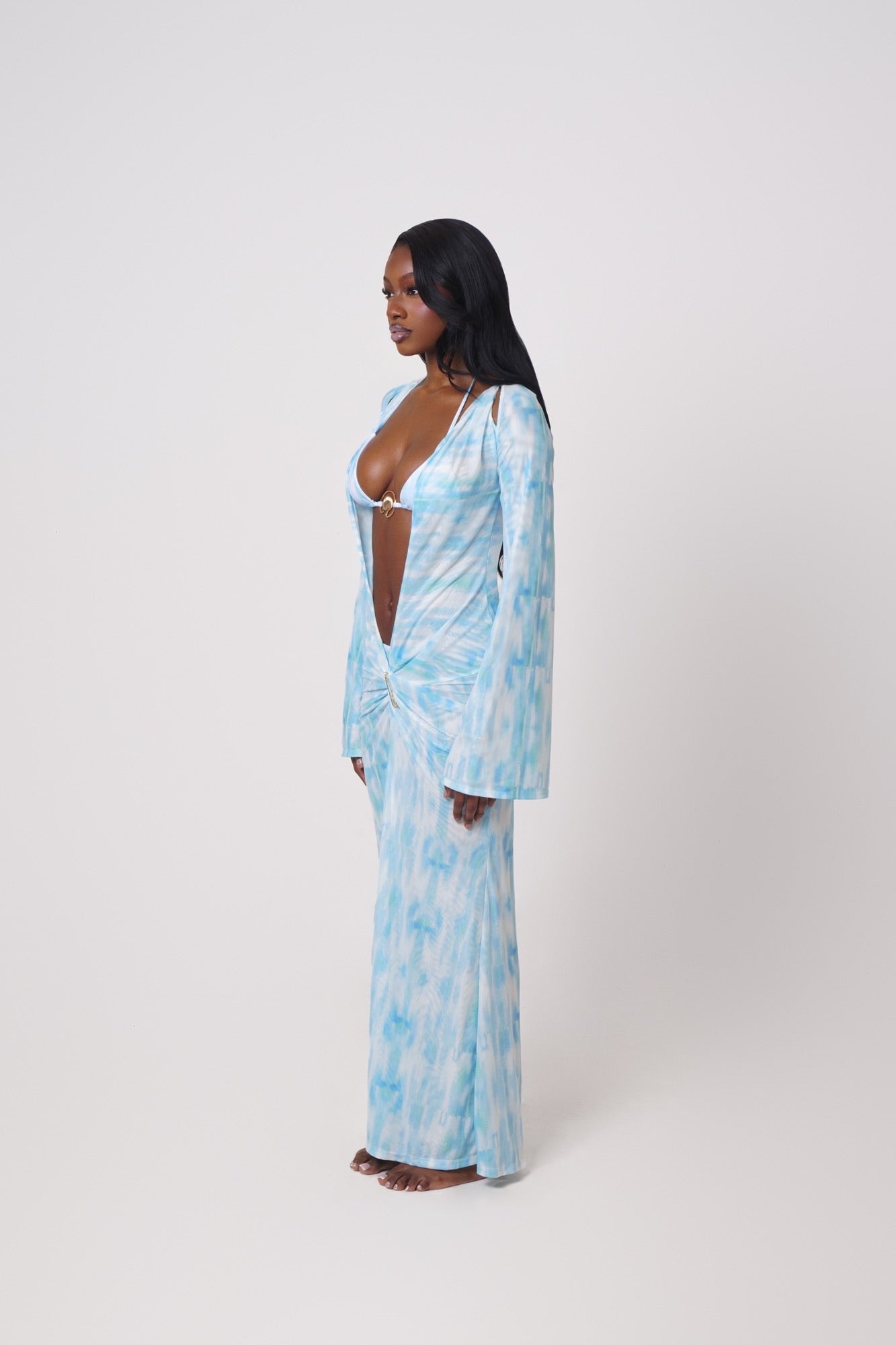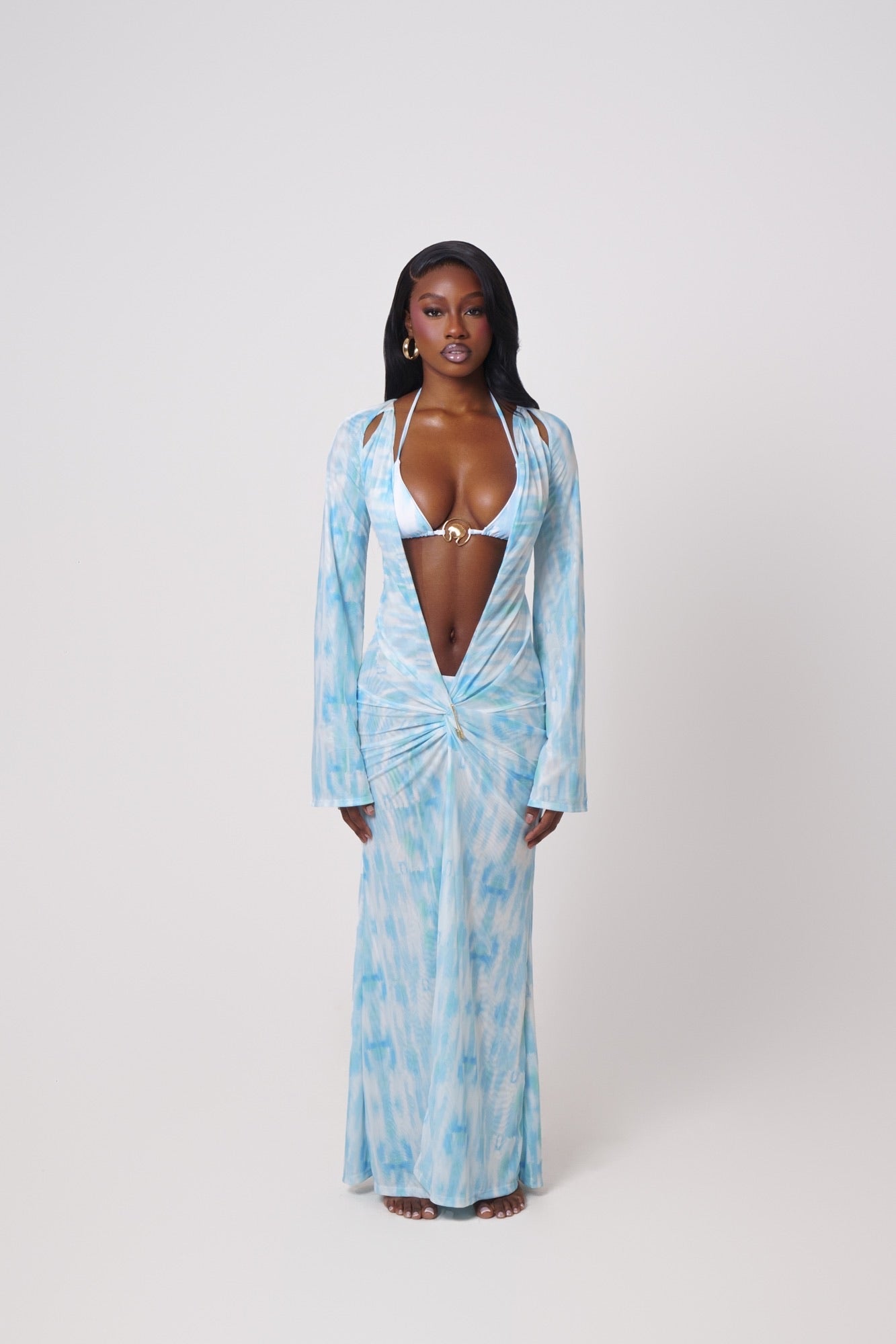 The Gaia cover-up is a summer staple for those who want to look stylish in the sun. Perfectly pairs with our Gaia bikini or any bikinis you may already own, made from custom printed mesh with gold plated and diamante encrusted pin in the centre. Features ruching in the centre, plunging neckline and cut out back.